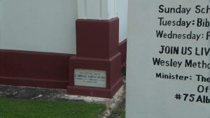 We’re taking you inside one of Belize City’s most historic landmarks, Wesley Methodist Church on Albert Street. At first glance, it looks like just another old building, but trust me, it’s full of secrets most people don’t know. For starters, check out the cornerstone outside. Engraved on it is the name of the man who governed Belize back in the day, His Excellency Ronald Garvey. But that’s just the beginning. Hidden behind those stone walls is a time capsule sealed more than seventy years ago. Inside are a glass bottle, currency from the era, and even a copy of a newspaper from that time.