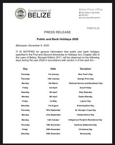 The announcement, made by the Belize Press Office, confirms the dates on which national observances will be celebrated across the country.